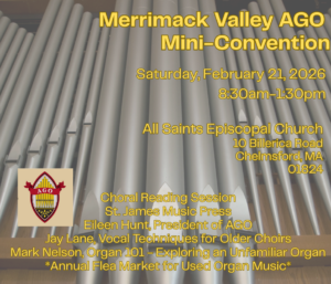 The Merrimack Valley AGO presents their annual Mini-Convention, held at All Saints Episcopal Church, 10 Billerica Road in Chelmsford, Saturday morning February 21, 2026. Please follow the link for on the MVAGO website in order to register. Please note that if you want the catered lunch, the registration deadline is Friday February 14th.